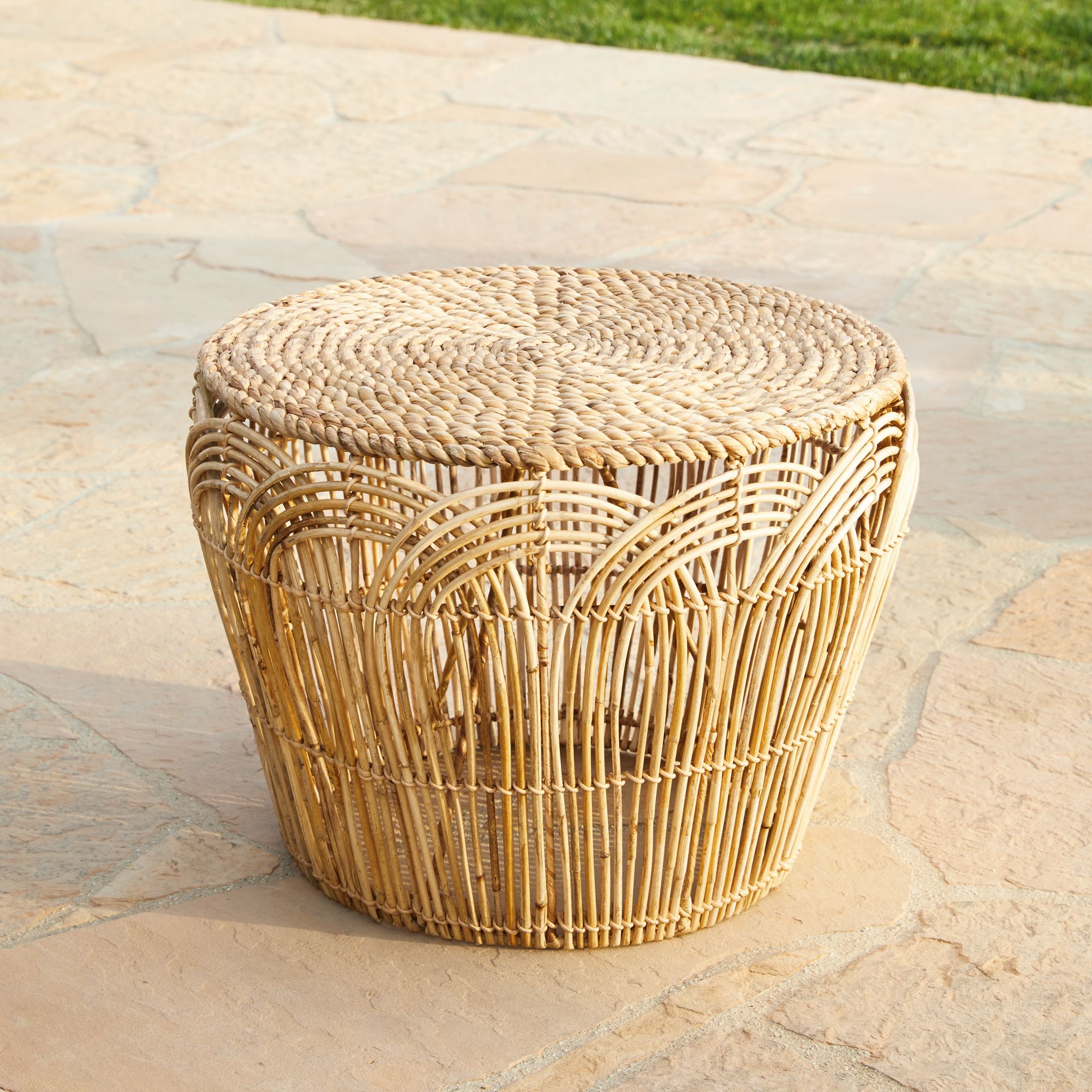 The design features a round woven top and decorative sides around a metal frame The looped interwoven-twist roping is handmade from natural rattan and water hyacinth rope. Because it is handmade from natural fibers, slight variations in color and pattern may occur. Note that for outdoor use it should not be exposed to wet or damp conditions, and should be shielded from direct sunlight to avoid fading. A great accent for a Bohemian or Coastal style room.